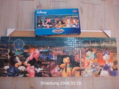 完成啦!超級開心哩~本來前面還有一次進度的照片,但是不知道被我存檔到哪去了!拼到最後剩下幾塊,我怎樣就是不想給老公拼!硬是自己抓在手上哈哈哈哈....因為我本來放在腳邊,他硬是來偷拿咩!很氣內!!仔細上膠,他很熟練啦,這是第三幅了~這姿勢讓我想到他工作時候....等明天乾了就可以裝框囉!Oh Ya~掛在客廳當裝飾!接下來....是要買可愛版迪士尼人物的那幅嗎?