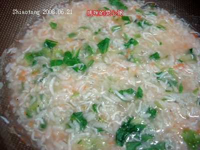 4.再滾一下下就可以丟入切小塊(絲或菜泥)的小黃瓜和青菜,煮一下就可以起鍋。
