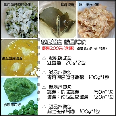 副食品試吃 限量10 份原價285摳試吃價只要200摳 (含低溫宅配150的運費)大孩子也可以吃,請註明年齡米阿姨不磨泥就OK囉!!訂購以後統一8/22寄出!請多支持米阿姨的副食品賣場,感恩ㄟ!!