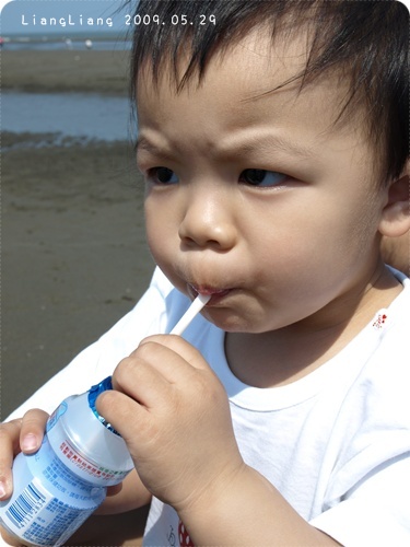 於是我們把早起的靚靚叫醒就下車玩沙,