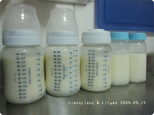 一天擠出來所有的奶先放在集乳瓶,還好Vicky娘有借我好多大集乳瓶,本來以為用不到