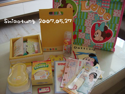 塑膠圍兜兜、北鼻用的洗衣精、沐浴乳、護膚膏等試用品...