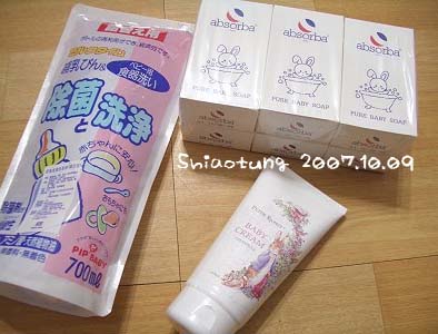 奇哥食器清洗液、absorba嬰兒香皂、奇哥彼得兔嬰兒金盞菊乳液。